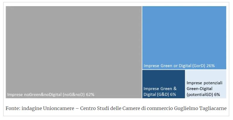 Solo il 6% delle imprese è “arrivato al traguardo” o comunque è nel tratto finale del percorso della duplice transizione digitale e ecologica. Mentre quasi 2 imprese su 3 sono ancora ai blocchi di partenza. È quanto emerge da un’indagine di Unioncamere e Centro Studi delle Camere di Commercio Gugliemo Tagliacarne su un campione di 3.000 imprese manifatturiere. Se sono poche le imprese Green&Digital (G&D) che nel 2020 hanno raggiunto la meta avendo già investito sia in eco-innovazione sia in digitalizzazione, il 26% dell’imprenditoria manifatturiera si trova a metà strada, avendo investito nella sostenibilità ambientale o in Industry 4.0 (imprese GorD). Tuttavia la stragrande maggioranza delle imprese (62%) non ha investito e non ha intenzioni di investire né in sostenibilità ambientale né in digitalizzazione (imprese noG&noD). Mentre una piccola quota di imprese (6%) pur non avendo ancora investito nella duplice transizione ha messo in programma di investire nel green e/o nel digitale (imprese potentialGD).