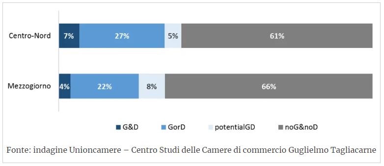 È al Sud che si registra il maggiore ritardo: il 66% delle imprese del Mezzogiorno non ha investito e nemmeno ha in programma di investire nella transizione verde e digitale contro il 61% del Centro-Nord. Nel Mezzogiorno esiste un gap guardando sia alle imprese che hanno già investito nella Duplice transizione (imprese G&D Mezzogiorno 4% vs 7% Centro-Nord) sia, soprattutto, a quelle che sono a metà strada avendo investito in uno dei due pilastri della Duplice transizione (imprese GorD Mezzogiorno 22% vs 27% Centro-Nord).