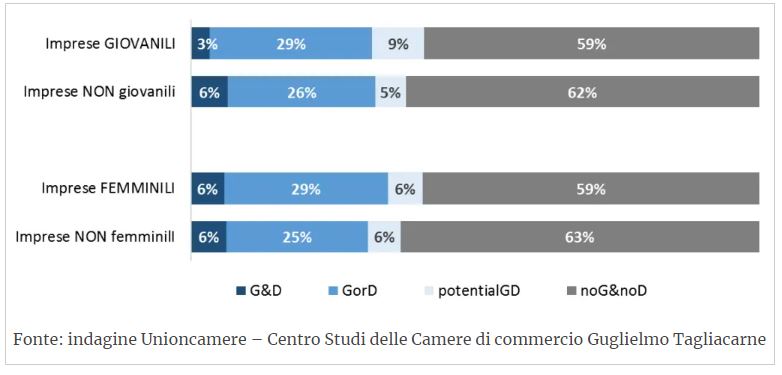 Ma tra le stesse imprese giovanili (rispetto a quelle non giovanili) è più elevata sia la quota delle imprese che hanno compiuto almeno un passo verso la transizione verde e digitale (imprese GorD 29% vs 26%), sia la quota di quelle che non avendo compiuto passi fino adesso prevedono però di compierli (imprese potentialGD 9% vs 5%).