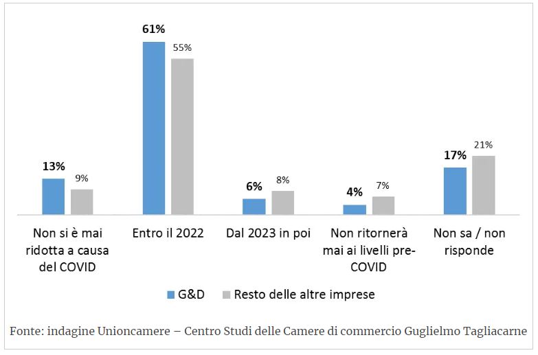 La ripresa economica non può che passare dalla Transizione ecologica e digitale: un ritorno ai livelli produttivi pre-Covid entro il 2022 è previsto dal 61% delle imprese che hanno investito sia in eco-innovazione sia in digitalizzazione (imprese G&D) contro il più ridotto 55% del resto delle altre imprese. Mentre non si è mai ridotta la propria attività produttiva a causa del Covid, per il 13% delle imprese che hanno investito sia in eco-innovazione sia in digitalizzazione contro il 9% delle altre.