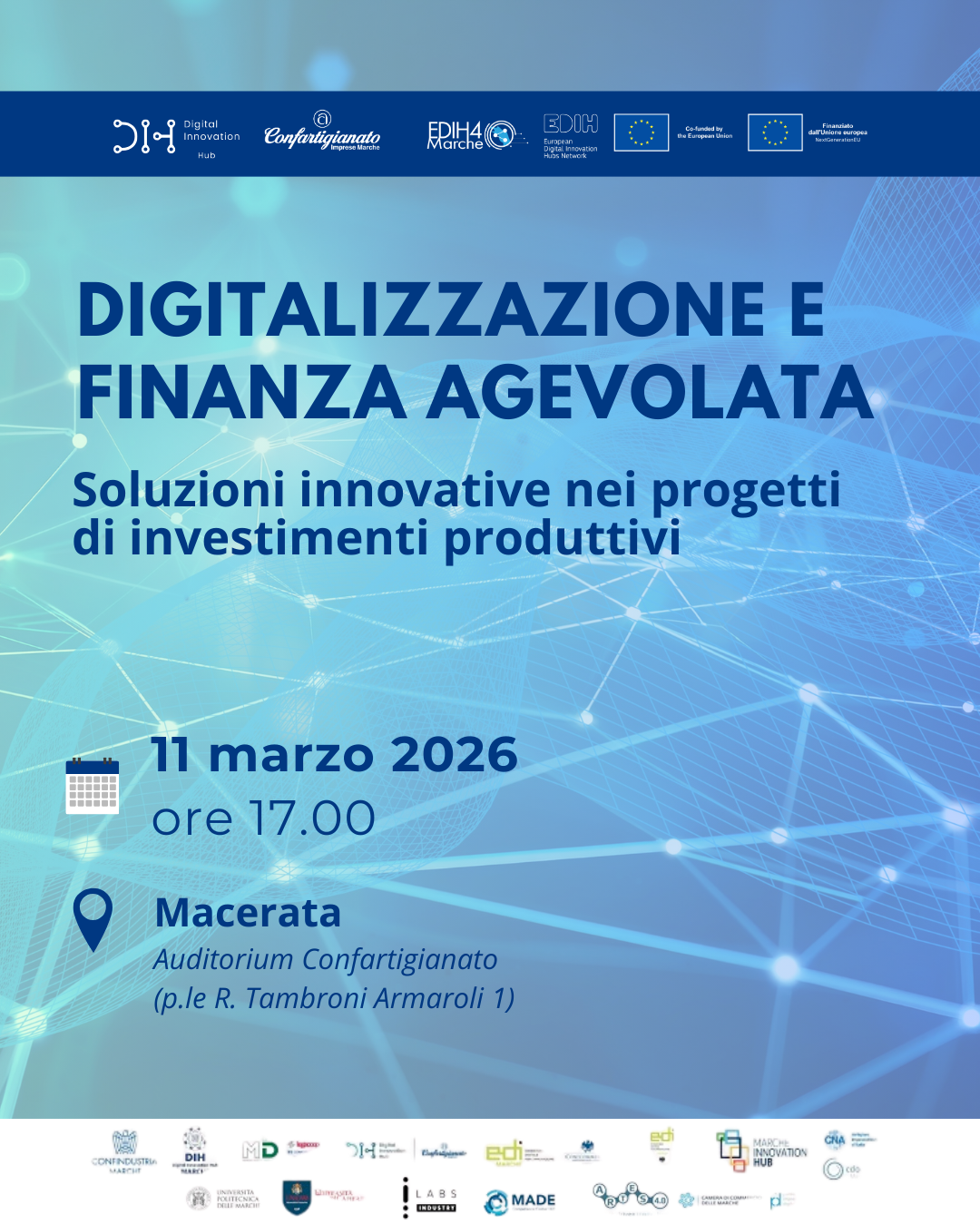 Il Digital Innovation Hub di Confartigianato Marche, nell’ambito del progetto europeo EDIH4Marche, organizza un incontro dedicato alle nuove opportunità offerte dalla finanza agevolata per soluzioni innovative nei progetti di investimenti produttivi, con un accento sull’importanza dell’integrazione tra finanza agevolata e digitalizzazione.