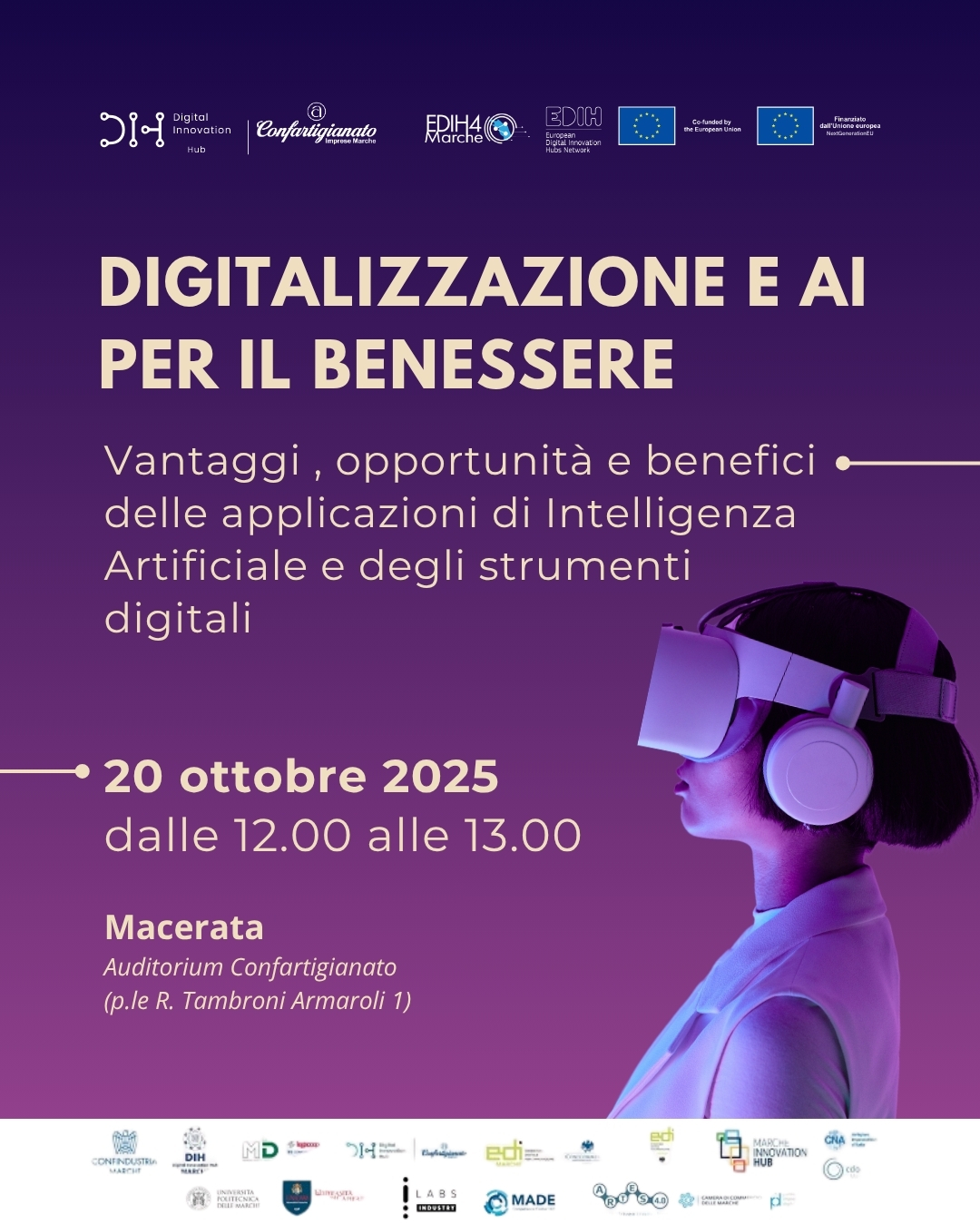 Il Digital Innovation Hub di Confartigianato Marche, nell’ambito del progetto europeo EDIH4Marche, organizza un evento dedicato ad approfondire i vantaggi, le opportunità e i benefici che possono derivare dalle applicazioni di Intelligenza Artificiale e dall’utilizzo di strumenti digitali per il comparto del benessere.