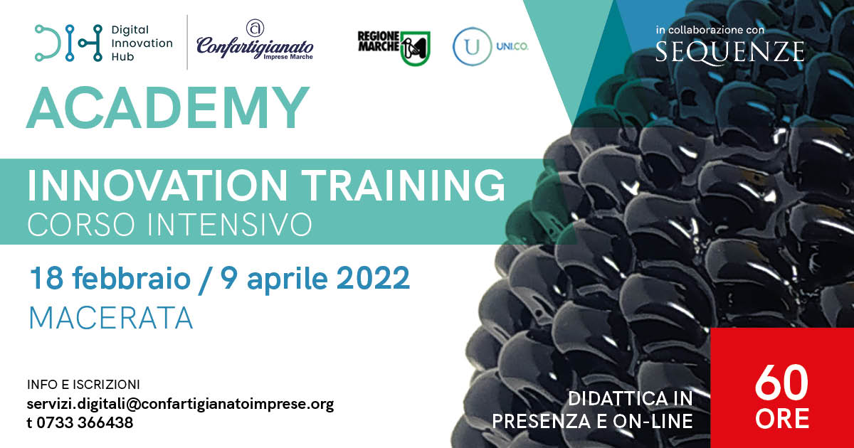 Per agire con maggiore incisività e specializzazione nel mondo del cosiddetto Digital Manufacturing, di grande interesse per la creazione e personalizzazione di prodotti e servizi da parte delle PMI, il DIH Confartigianato Marche ha dato vita ad una vera e propria Academy (corsi di modellazione 3D, corsi di formazione su nuovi materiali e processi, corsi di design industriale, laboratori di stampa, fresatura, taglio, trattamenti post produzione ed elettronica open source, per la formazione di nuove figure professionali in grado di progettare i prodotti del futuro, grazie alle tecnologie della fabbricazione digitale).