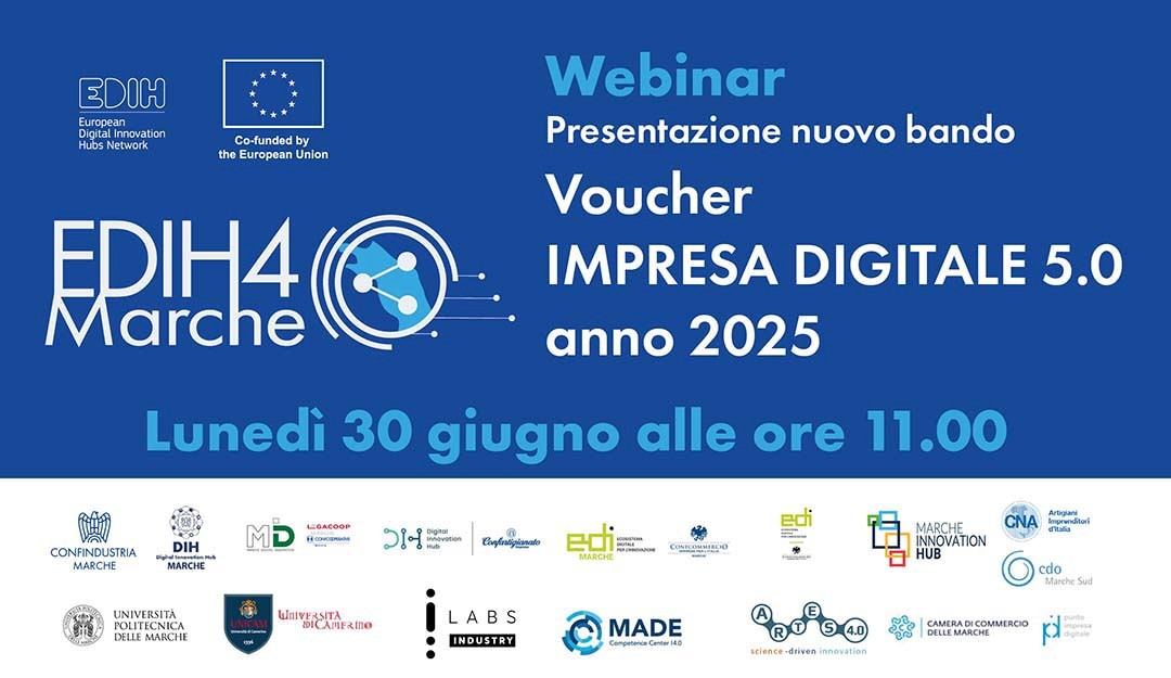EDIH4Marche, European Digital Innovation Hub (EDIH) nato dalla collaborazione dei 5 Digital Innovation Hub di tutte le categorie produttive regionali in collaborazione con la Camera di Commercio delle Marche e il PID Marche, ha il piacere di invitarvi al webinar di presentazione del nuovo bando camerale Voucher IMPRESA DIGITALE 5.0 anno 2025, che si terrà